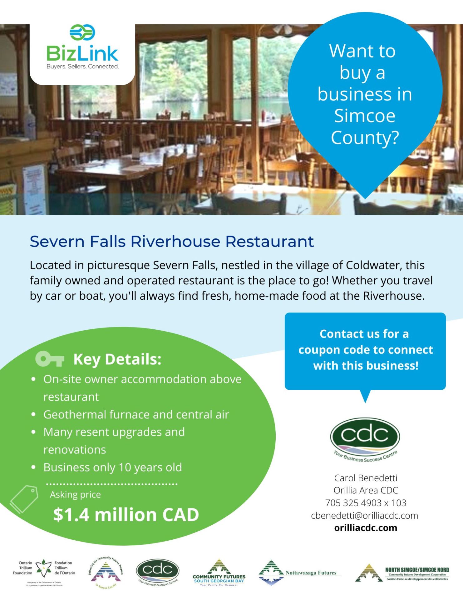 Dean and Roseanne had some conversations with Carol Benedetti of the BizLink program at the Orillia Area CDC. The BizLink program helps to connect business buyers and sellers within our region and is supported by a grant from the Ontario Trillium Foundation.
